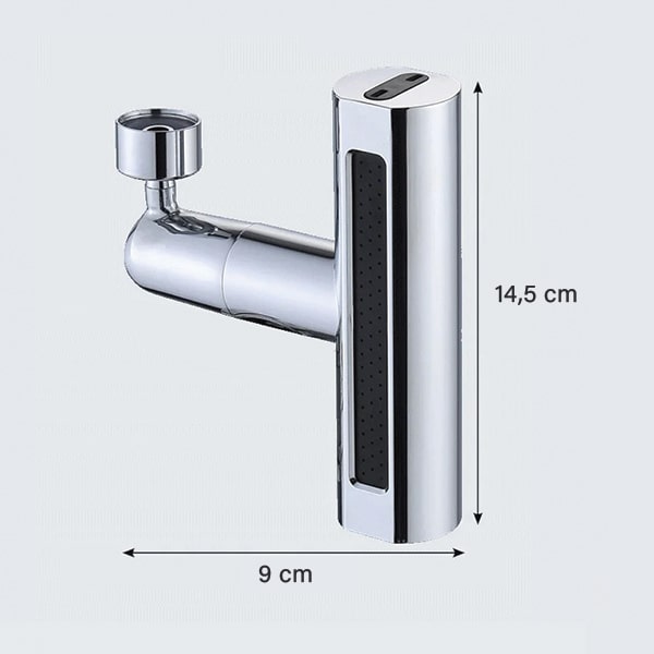 Medžiaga: ABS plastiko korpusas + žalvarinė jungtis Matmenys: 14,5 x 9 cm Purškimo režimai: 3 (srovė, burbulinė srovė, dulksna) Sukimasis: 360° Suderinamumas: tinka daugumai standartinių čiaupų (sriegių specifikacijas žr. instrukcijoje) Montavimo laikas: mažiau nei 30 sekundžių Reikalingi įrankiai: nereikia