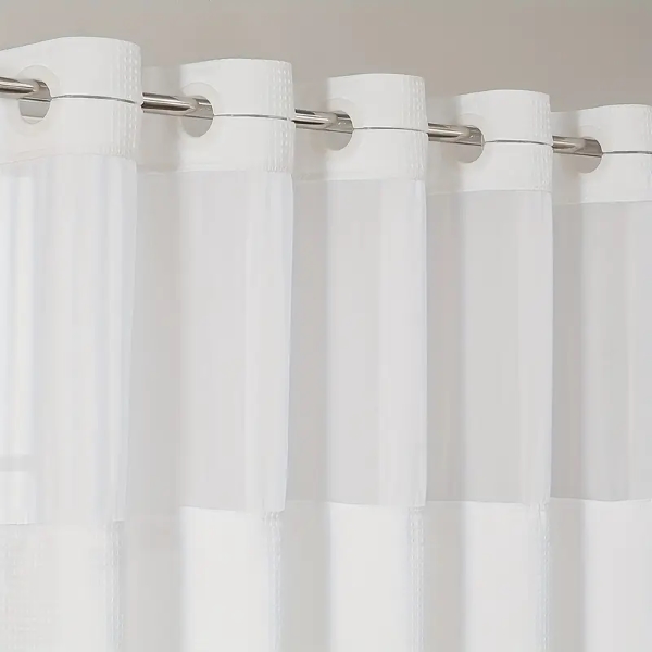 Novatoriška konstrukcija be kabliukų, papildyta spaudėmis, leidžia itin lengvai pakabinti ir nuimti užuolaidą, suteikdama daugiau patogumo ir funkcionalumo.