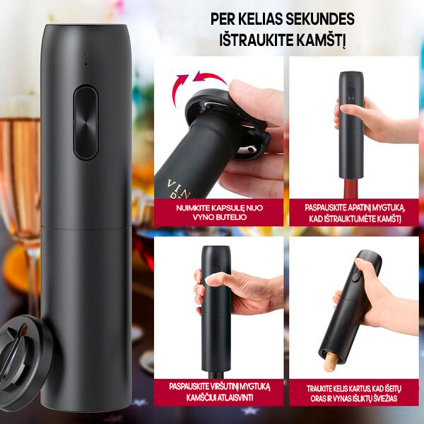 Vos vienu mygtuko paspaudimu per kelias sekundes ištraukite bet kokį kamštį, kad galėtumėte daugiau laiko mėgautis vynu ir mažiau vargti su buteliu.