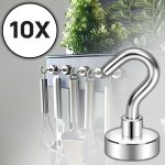 Mūsų 10 magnetinių kabliukų rinkinys gali išlaikyti maždaug po 10 kg, todėl puikiai tinka garažo įrankiams, virtuvės reikmenims, raktams, rankšluosčiams ir kt. kabinti.