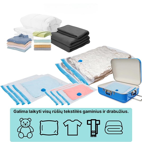 Trūksta vietos saugojimui? Sutaupykite iki 80% vietos su mūsų vakuuminiais maišais! Tiesiog supakuokite – užsandarinkite – ir išsiurbkite orą, kad sumažintumėte tokius didelius daiktus kaip drabužiai, antklodės ir patalynė. Daugiau vietos, mažiau netvarkos!