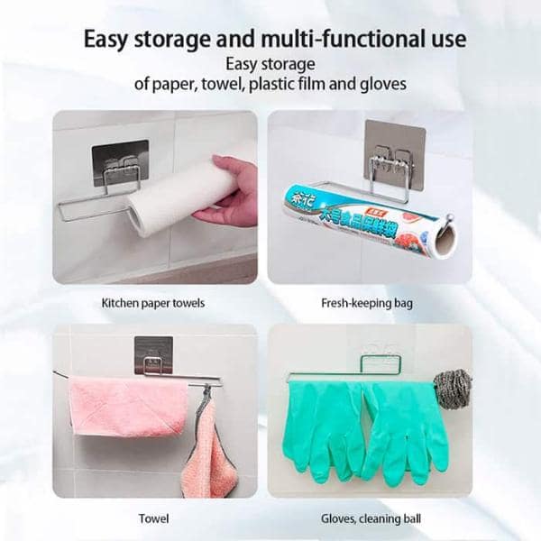 Atlaisvinkite vietą virtuvėje ir vonios kambaryje! Popierinių rankšluosčių laikiklį galima pritvirtinti prie bet kokio lygaus paviršiaus, įskaitant sienas, baldus ar plyteles!
