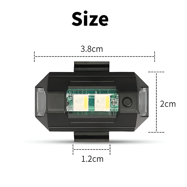 📏 Kompaktiški ir lengvi – 3,8 x 2 cm, ABS korpusas, komplekte yra 2 žibintai su lipniais padeliais, guminiais žiedais ir USB įkrovimo kabeliu.